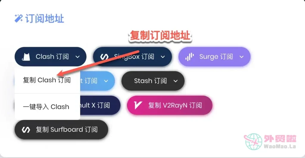 1、购买完成后,我们可以点击 Clash 订阅下的复制按钮。